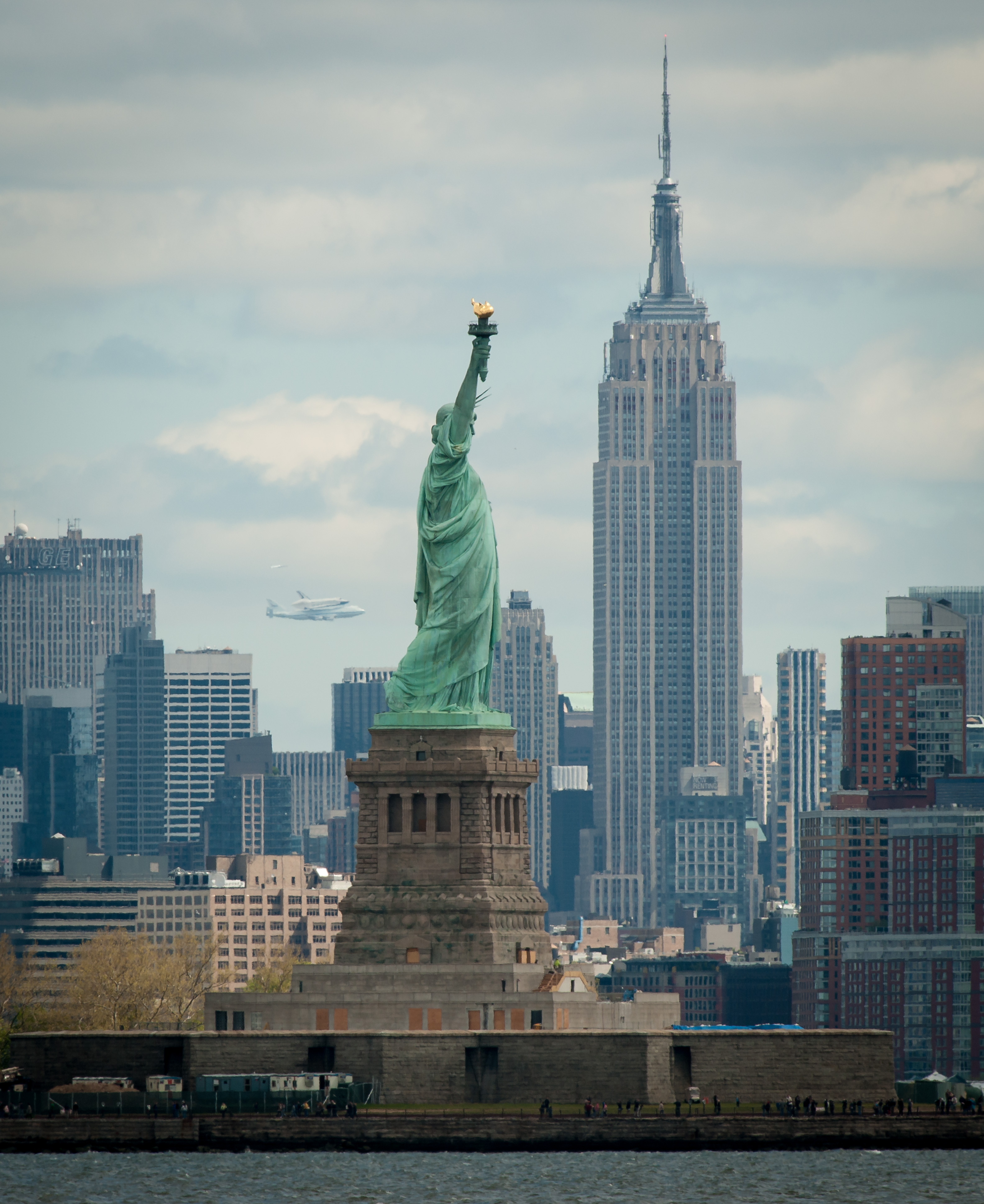 Space shuttle Enterprise, mounted atop a NASA 747 Shuttle Carrier Aircraft (SCA), is seen off in the distance behind the Statue of Liberty, Friday, April 27, 2012, in New York. Enterprise was the first shuttle orbiter built for NASA performing test flights in the atmosphere and was incapable of spaceflight. Originally housed at the Smithsonian’s Steven F. Udvar-Hazy Center, Enterprise will be demated from the SCA and placed on a barge that will eventually be moved by tugboat up the Hudson River to the Intrepid Sea, Air & Space Museum in June. Photo Credit: (NASA/Bill Ingalls)