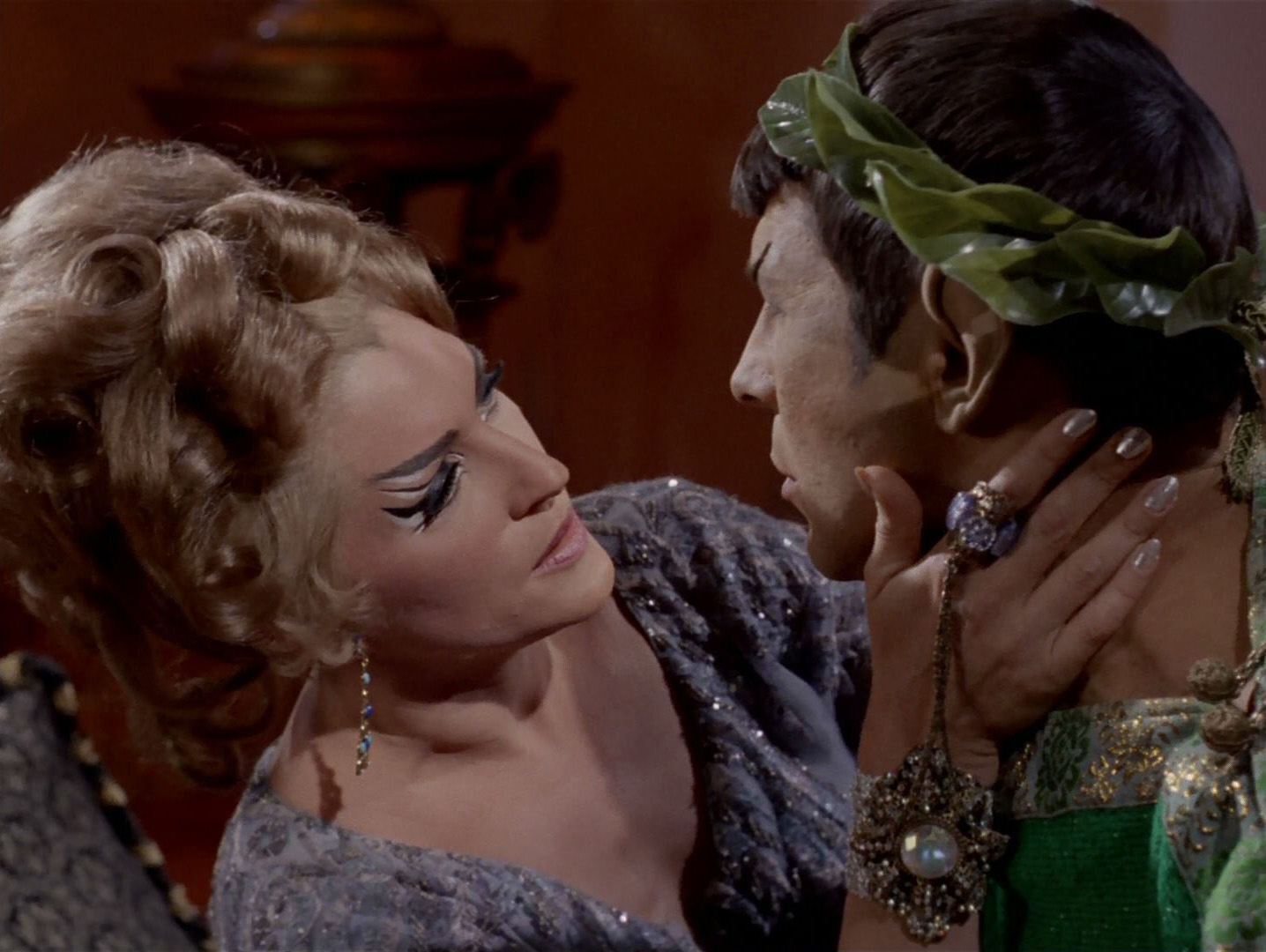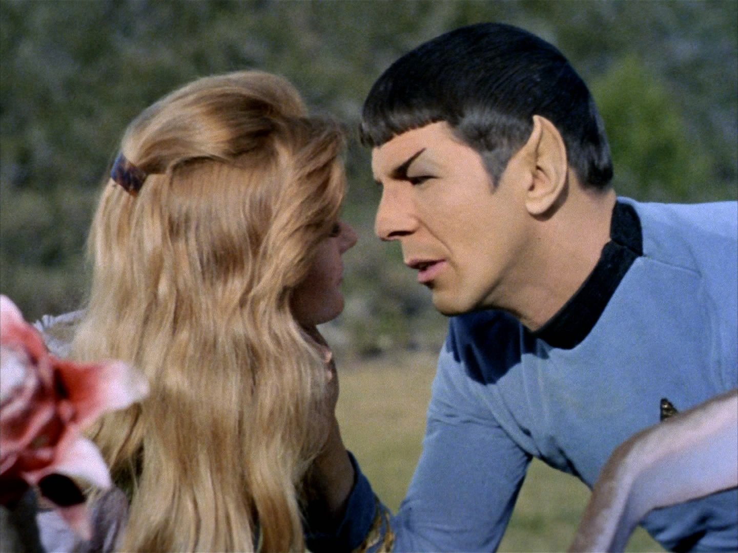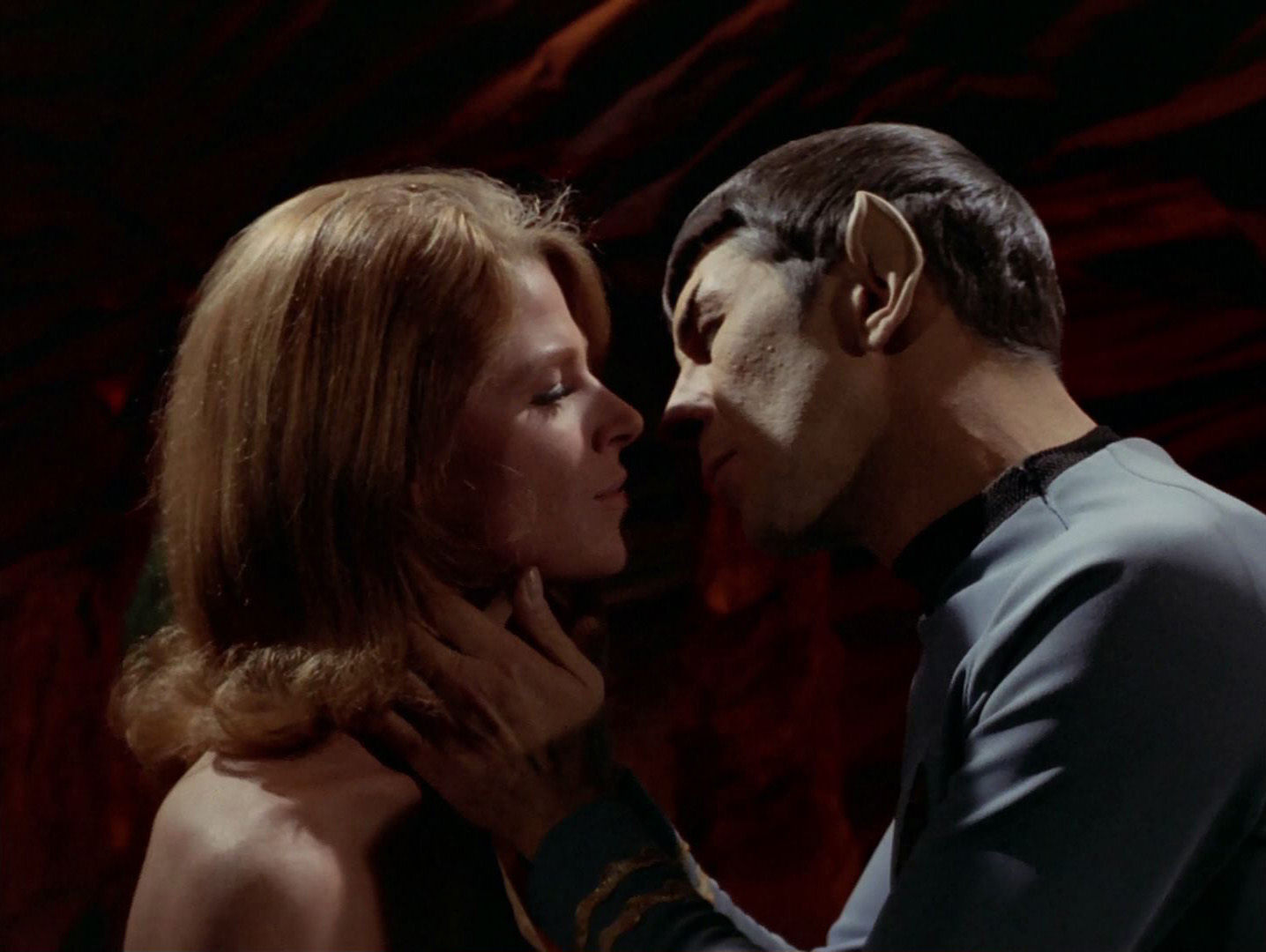 Nurse Chapel (and her incredible eyeliner) finally gets her wish, albeit forced. I see a pattern here in Spock love scenes — he’s always on the right! (Best kissing angle?)