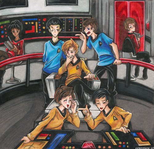 Here’s today’s fan art, an adorable Anime take on the Enterprise crew by Cobyfrog. I love the sloppy uniforms and devil-may-care attitude. Have a great weekend, everyone! I’ll be in NYC for a day trip tomorrow (Saturday) but I’ll be back here Monday. Ciao for now! Therese