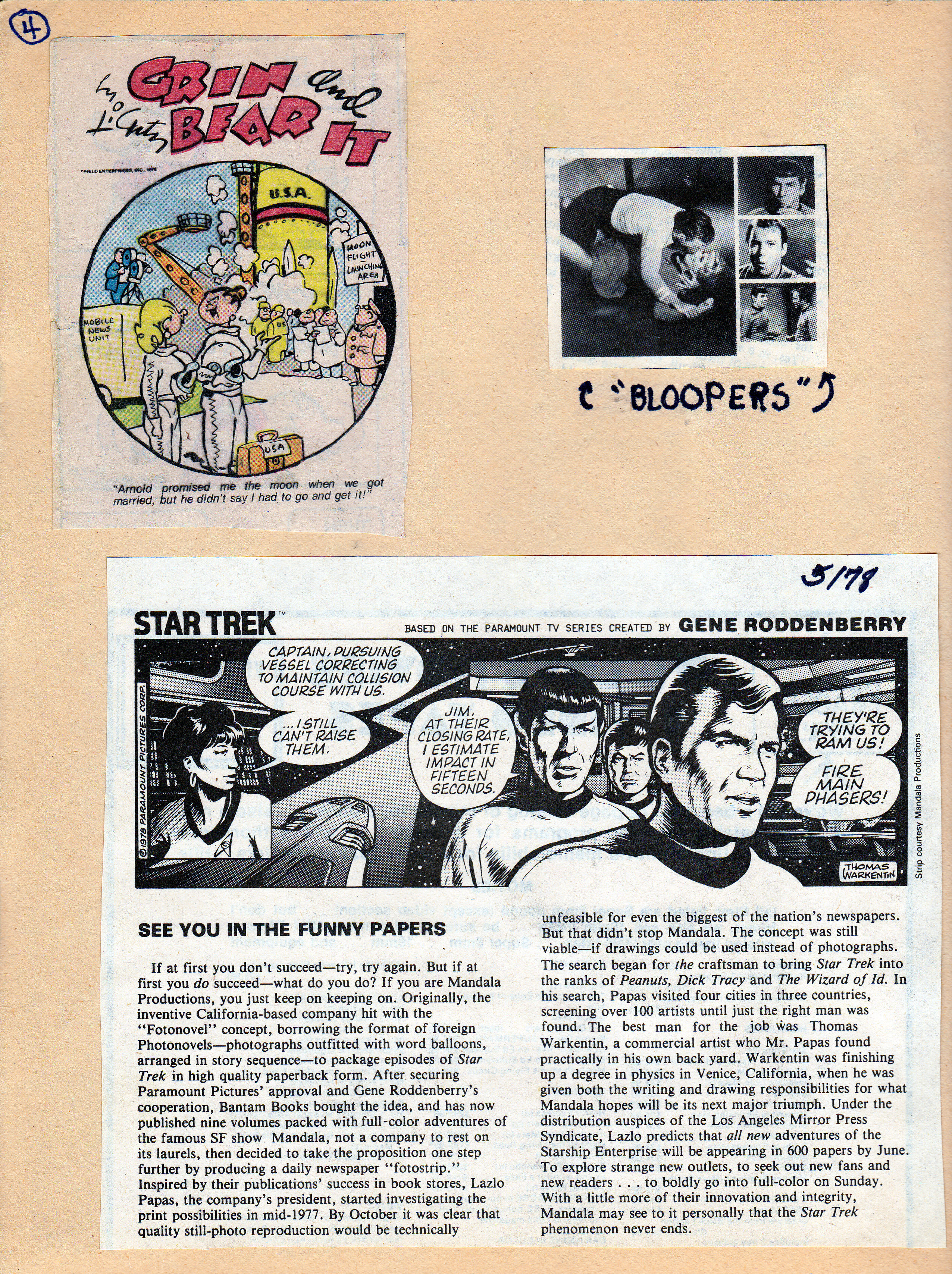Also keeping in the ‘funny’ range, another “Grin and Bear It” Sunday comic dealing with female astronauts, and a clipping from who knows where detailing some scenes from the famous Star Trek Blooper reels. (I always liked to keep my scrapbook pages along theme lines).