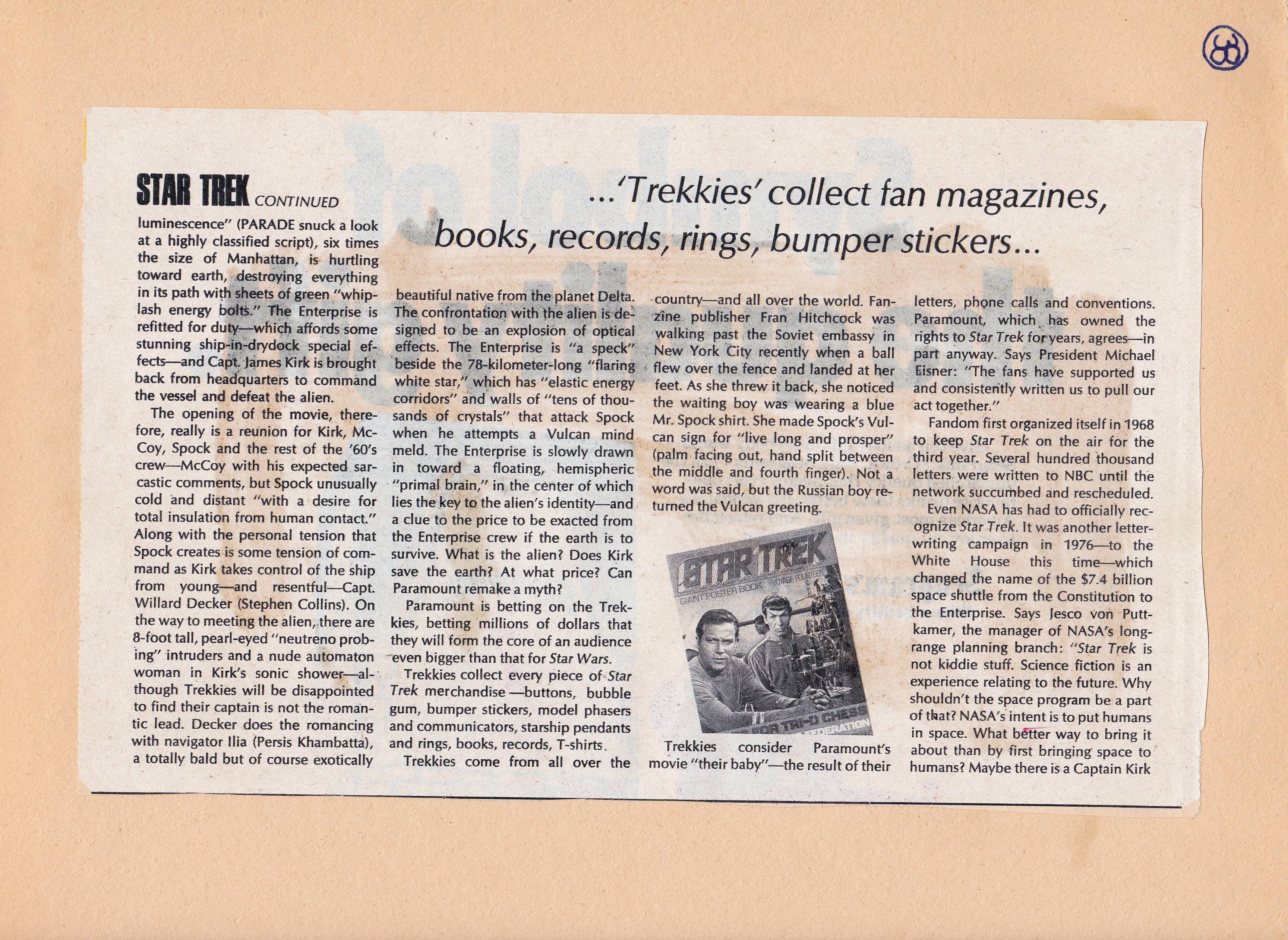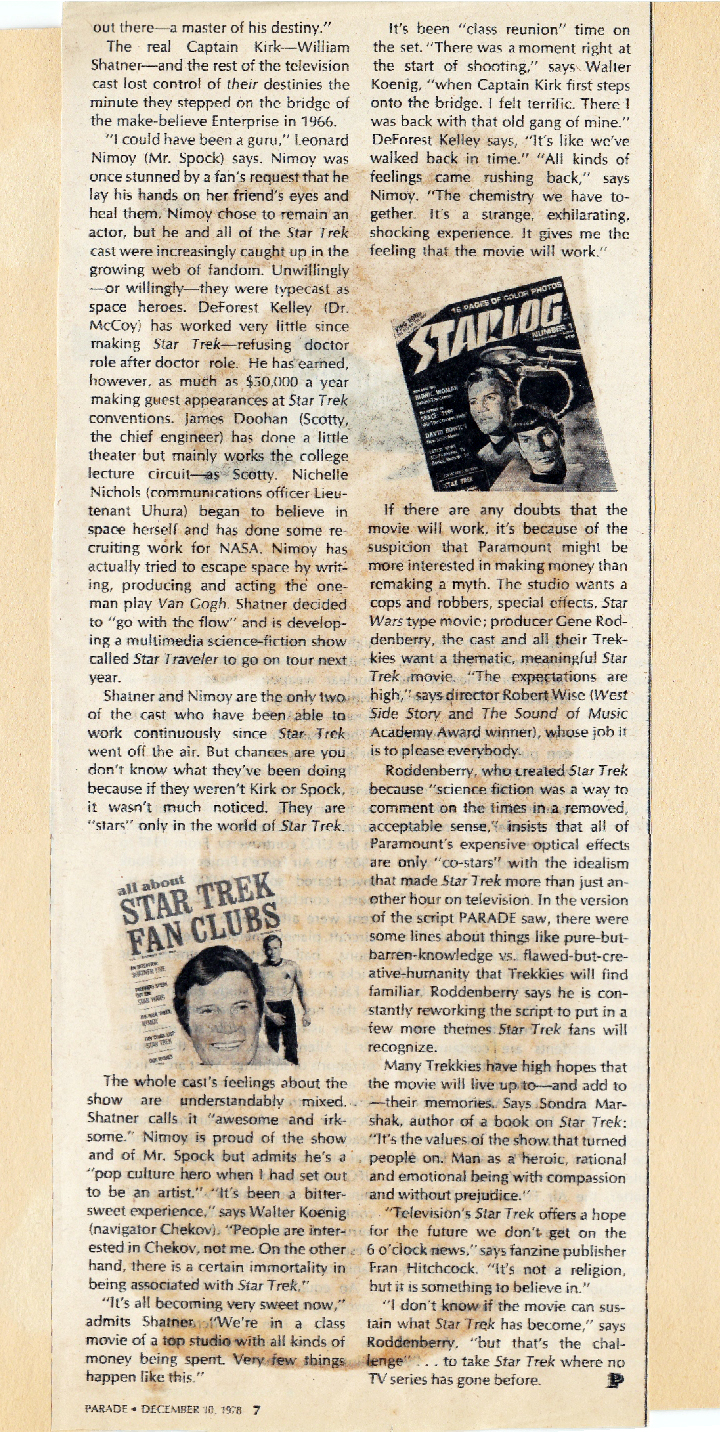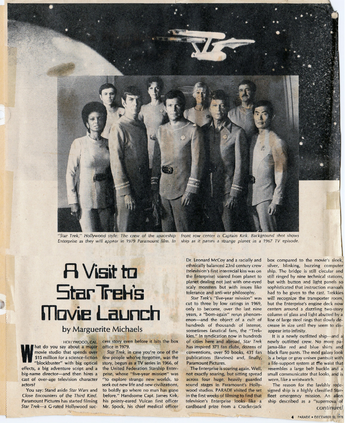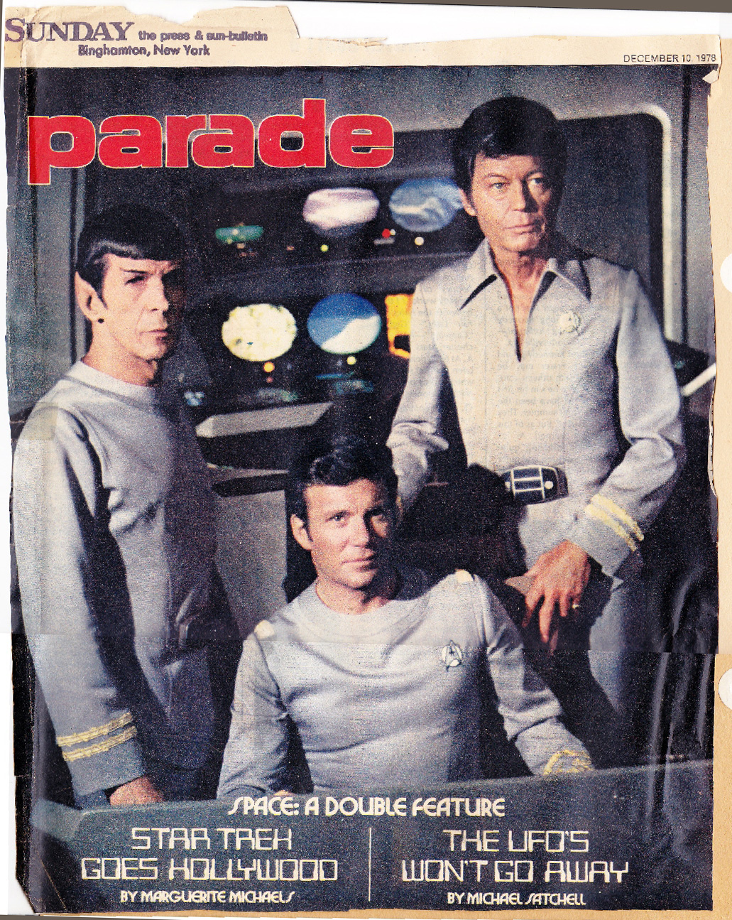Christmas came early for me in 1978, and seeing my heroes on the cover of the Sunday weekly Parade magazine was not only a thrill, but a validation of my fandom. Hey, if it was important enough to make the cover of Parade, it must be really big! The article previewing the movie was surprisingly long (3 pages!) but I took issue with it’s attitude about Trek and its stars. Especially the one quote: