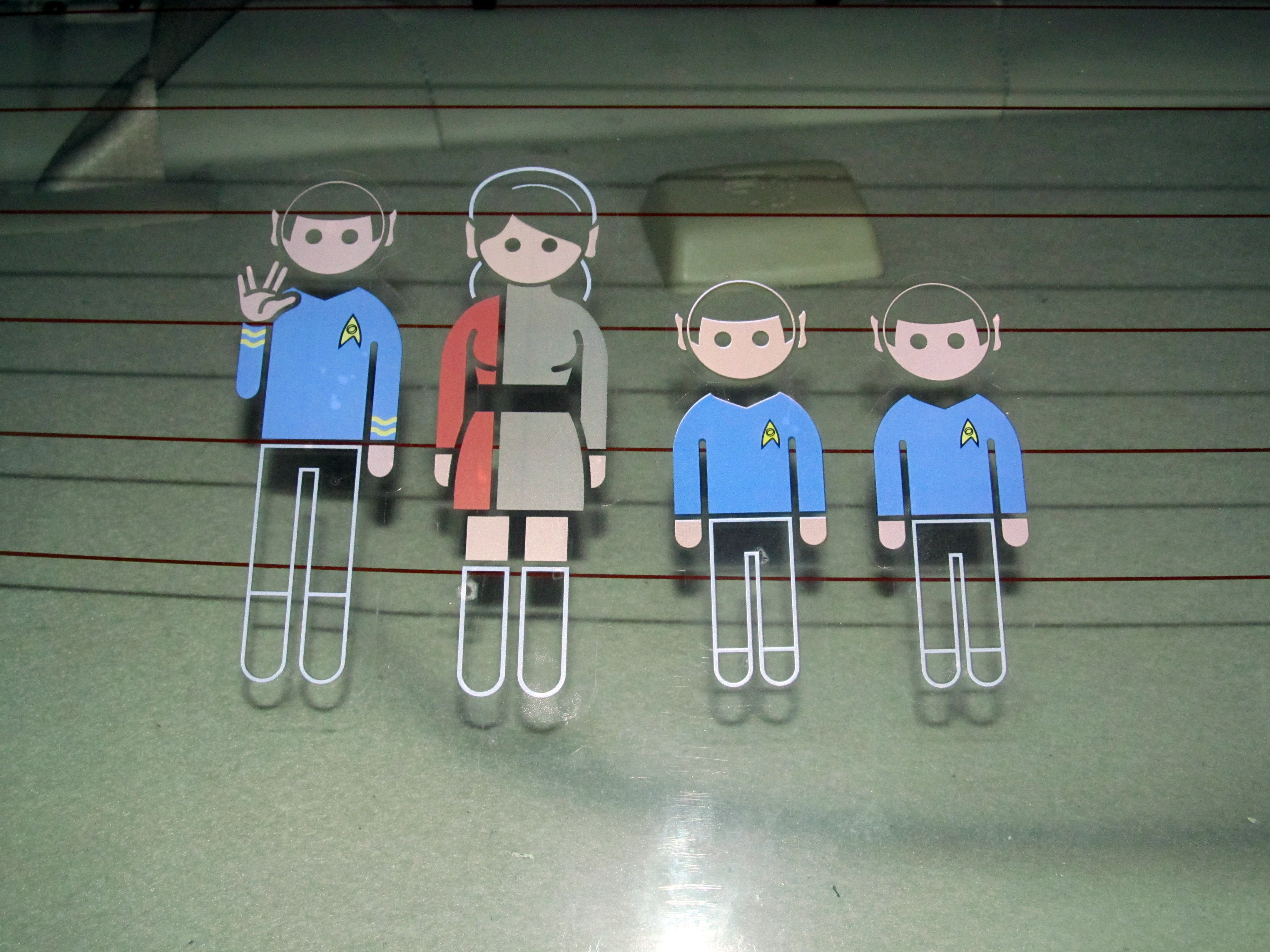 I’m sure you’ve seen many ‘family’ decals on the backs of mini-vans; you know the ones with a Mom, Dad, Kids, baby, dog cat, etc… I had avoided getting anything like these until now when I bought these recently at thinkgeek.com. I guess I just couldn’t resist them! Of course. I’m the Rom-Com married to Mr. Spock with our two little Spocks! However, if this was physically accurate, all three Spocks would tower over me! Oddly, the Rom-Com seems a tad taller than her Spock, but maybe it’s the hair!