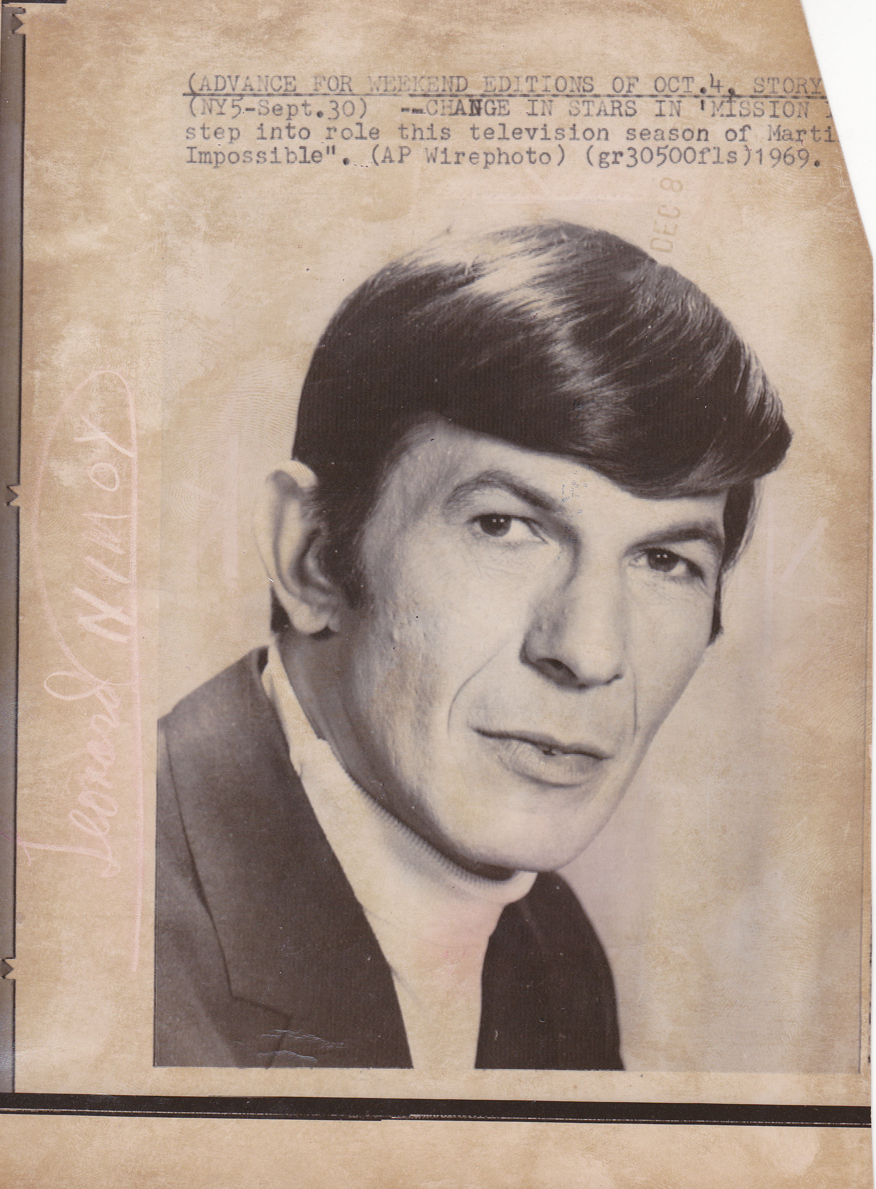 The original glossy from Historical Images with description. I believe the full caption above is: (ADVANCE FOR WEEKEND EDITIONS OF OCT. 4 STORY –CHANGE IN STARS IN ‘MISSION IMPOSSIBLE’ Leonard Nimoy steps into roll this season of Martin Landau’s character for Mission: Impossible”.