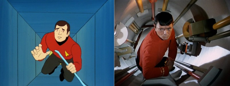 Scotty in a shaft in “Once Upon a Planet” and in the Jeffries Tube in “The Naked Time”.