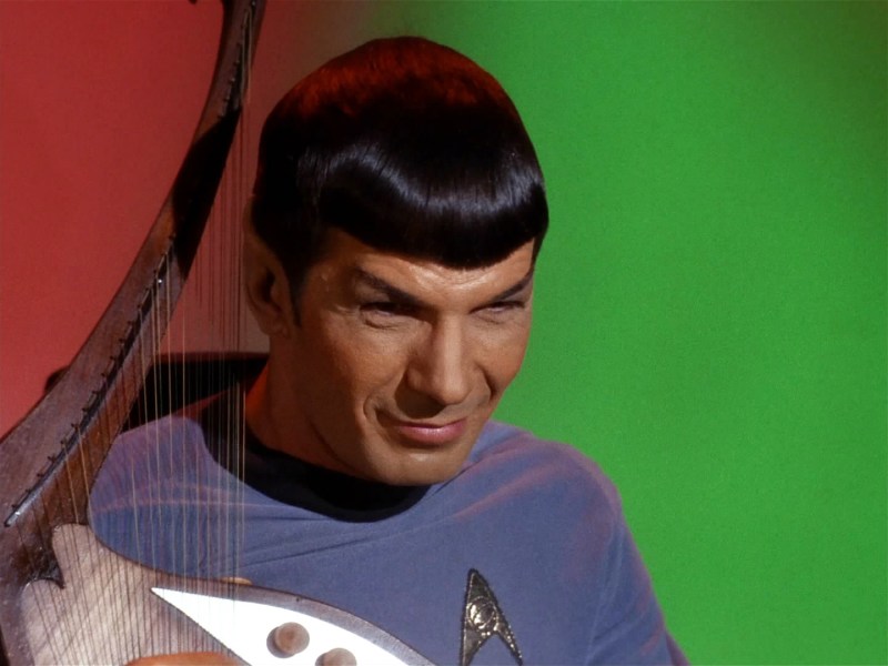 Spock grins while playing his harp.