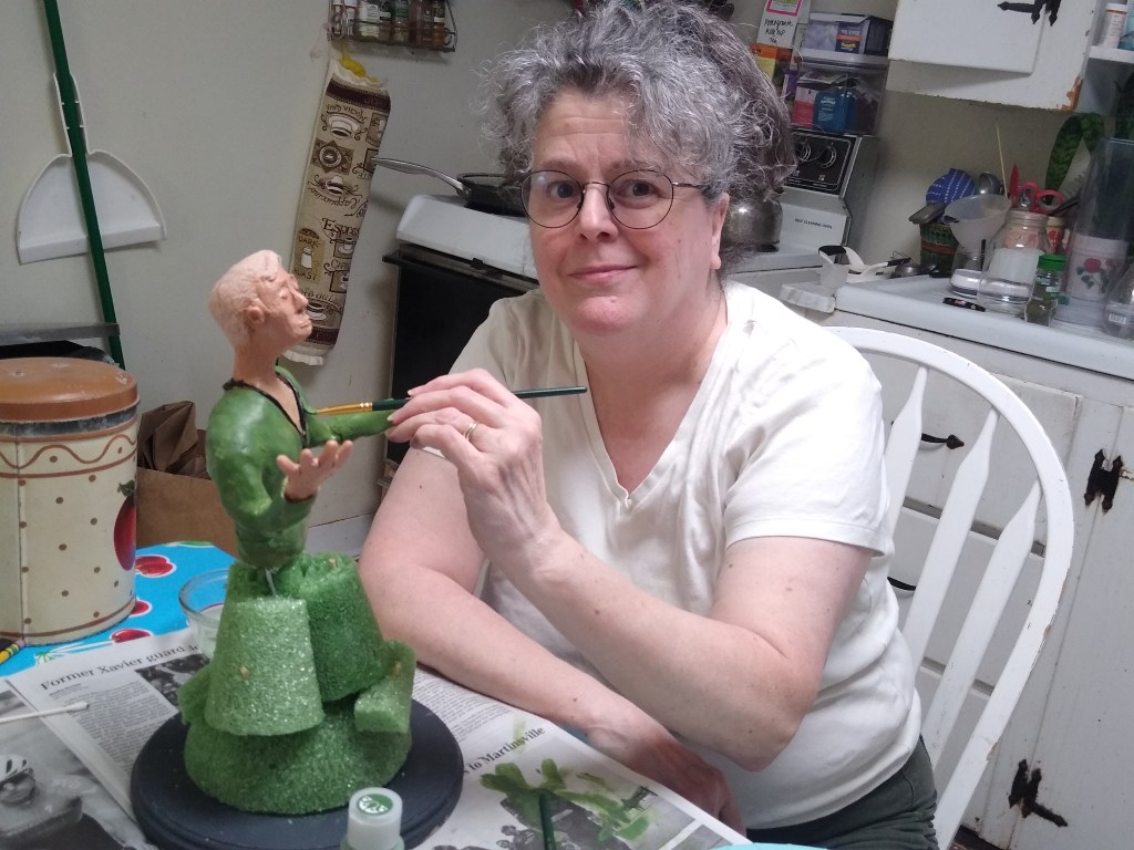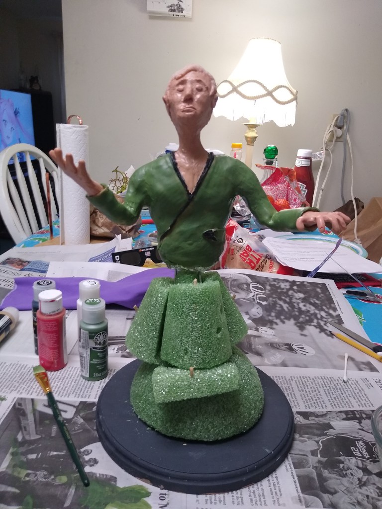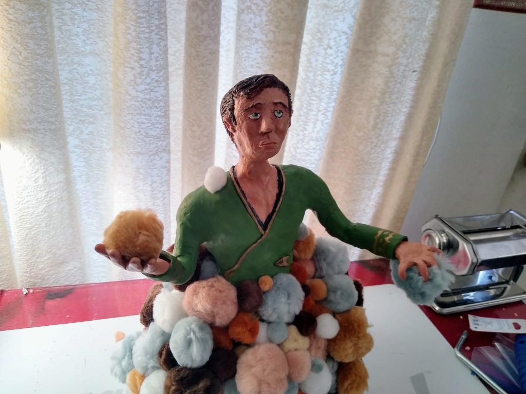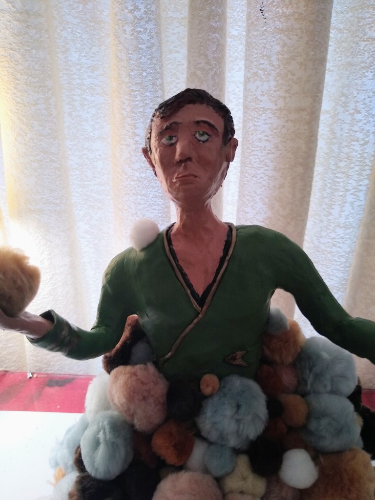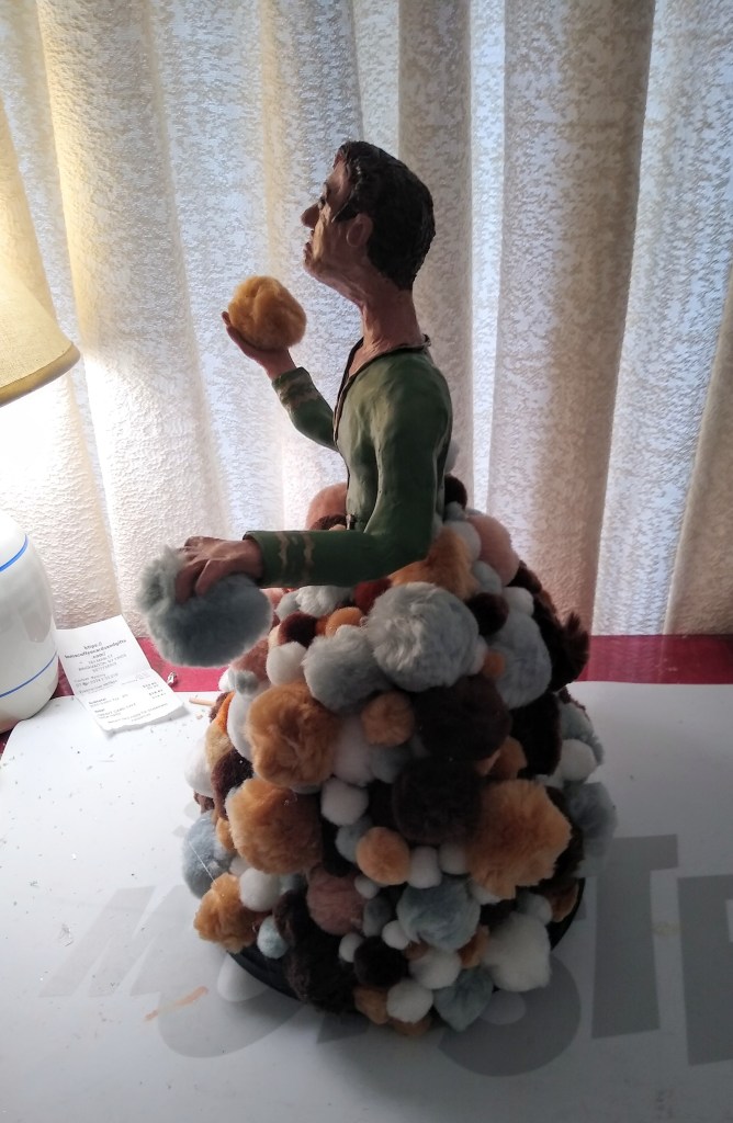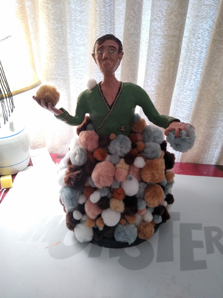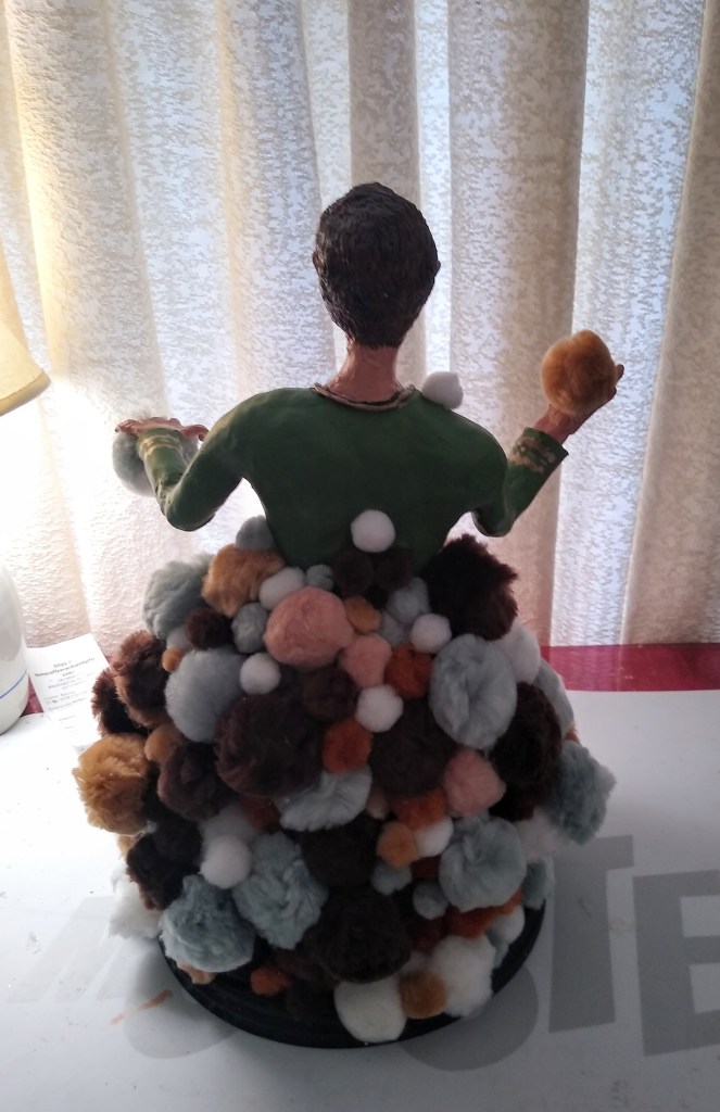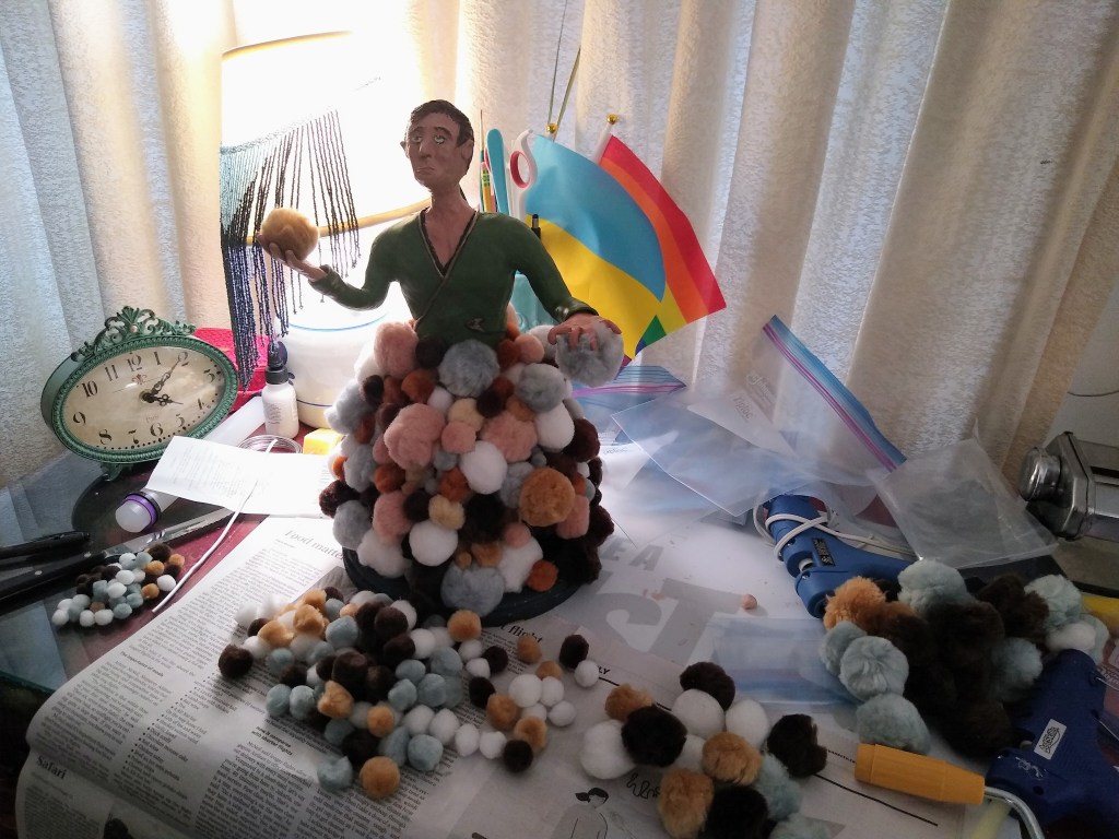 Of course I wasn’t sure how I’d make the sculpture. I considered a fabric one, with felt to be stuffed and painted with the pom-poms glued on, but the logistics bugged me. What proportions could it be and how to keep it stable? I let the idea stew for a while, and like many of my creative dreams, the pom-poms got put aside and buried among many of my creative dreams piling up in my closet.