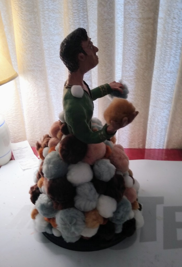 So the project actually started years ago when I was in a craft shop and spotted a cute bag of craft pom-poms that looked like little tribbles with their perfect coloring of beige, brown, and white. I thought, it would make an cute sculpture someday with Kirk engulfed by tribbles! I bought the pom-poms with great ambition.