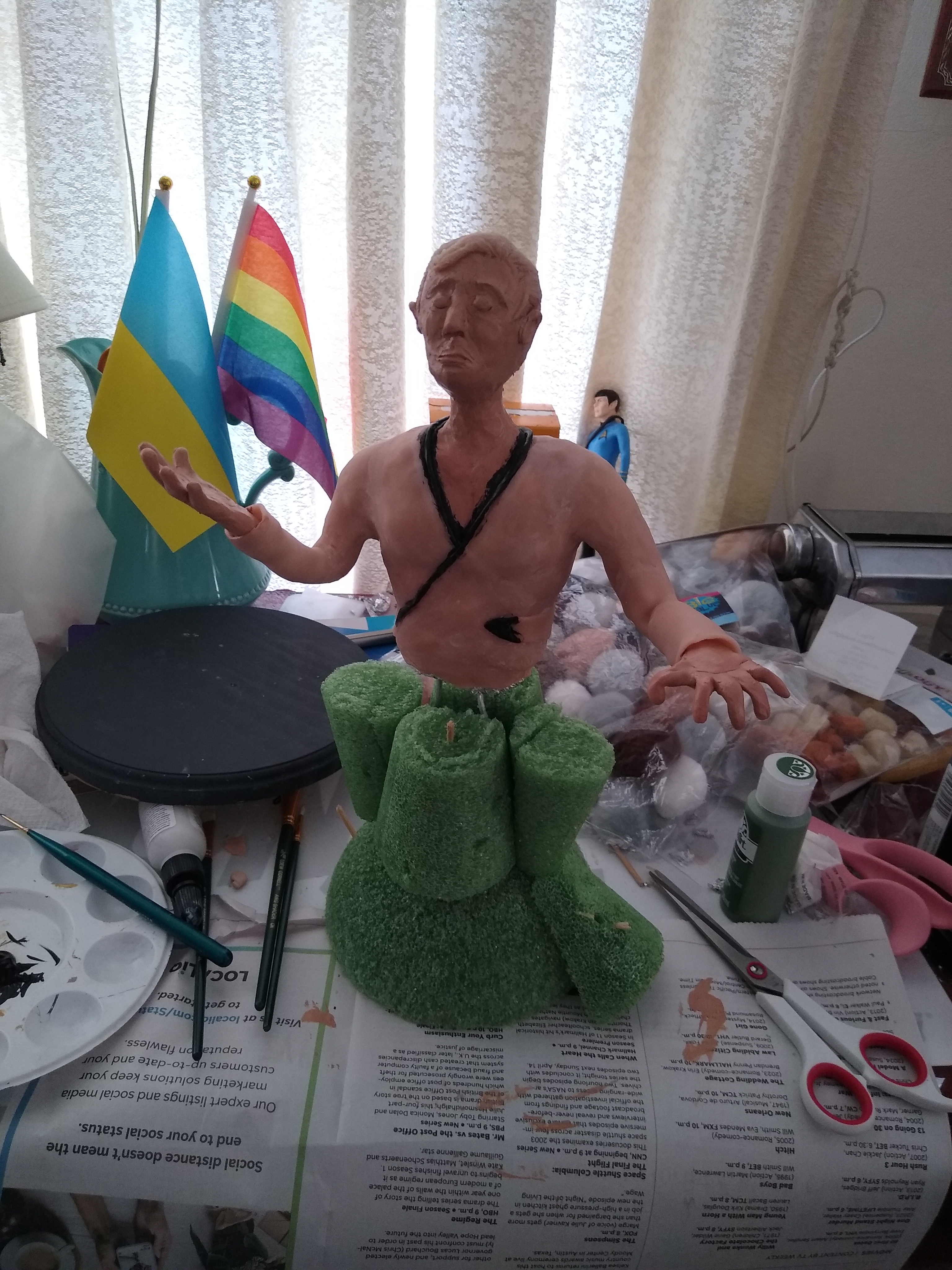 Of course I wasn’t sure how I’d make the sculpture. I considered a fabric one, with felt to be stuffed and painted with the pom-poms glued on, but the logistics bugged me. What proportions could it be and how to keep it stable? I let the idea stew for a while, and like many of my creative dreams, the pom-poms got put aside and buried among many of my creative dreams piling up in my closet.