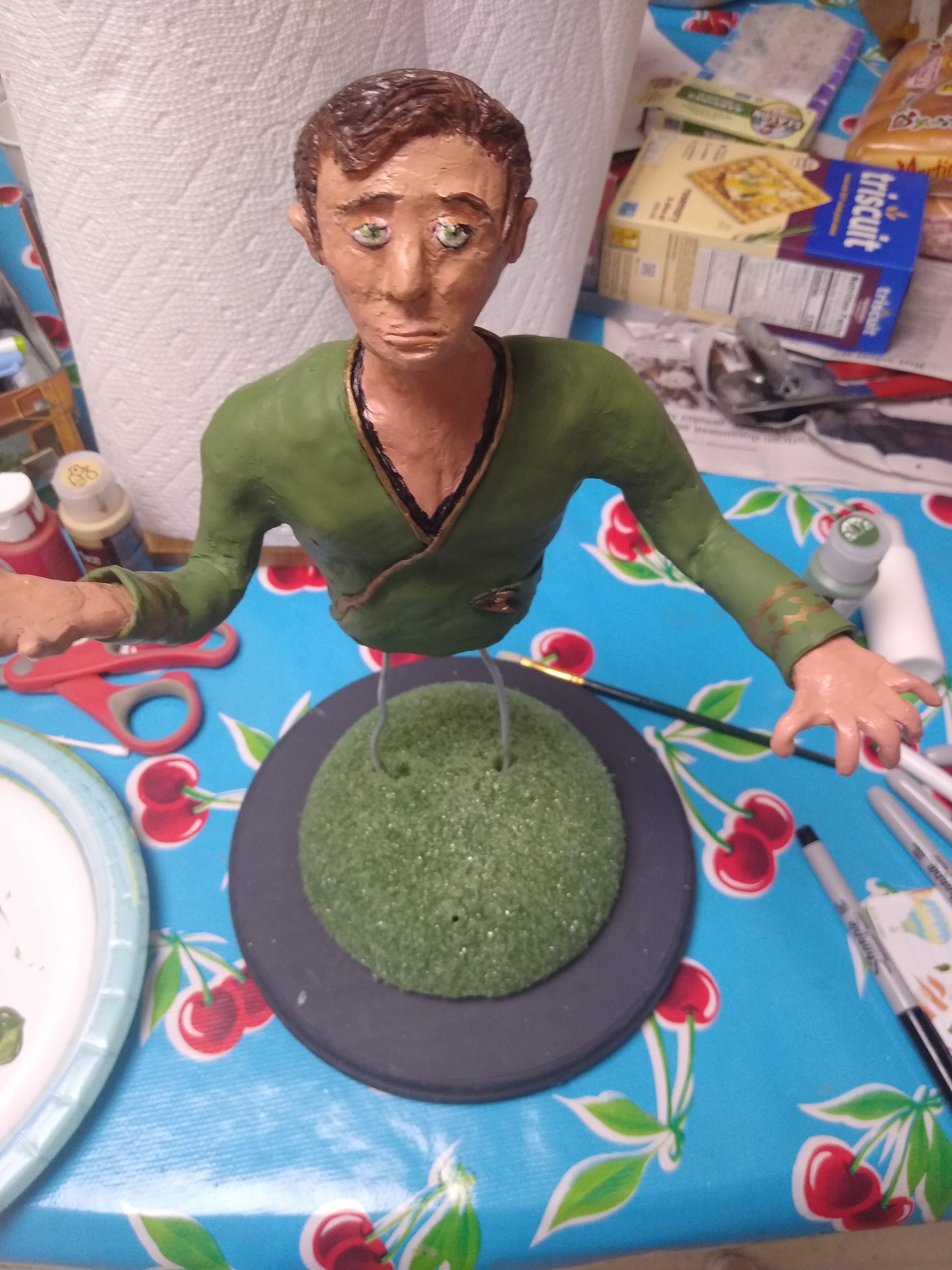 I’m very happy with the result and I think it’s okay for my first attempt. Of course I see its imperfections, (to me he looks more like Nicolas Cage that Bill Shatner) but that’s what learning is all about! I cannot describe the marvelous gratification one can have from creating something from scratch. And I am thrilled to add it to my other creative projects (photography and digital collages) — it is just a wonderful tactile, focusing hobby that challenges not only my sculpting skills, but painting too. Good for fine motor skills, and and just basic happiness! (And it only took 20+ years or so to make!) I cannot wait to start new project ! Enjoy the gallery, and watch the captain come to life! (I’ll have to share this with William Shatner!)