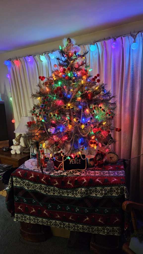 This year I didn’t want to assemble our entire thirty-two year old, 7-foot tree, so I managed to ‘shrink’ it by only using half of the supporting pole and two tiers of branches plus the topper. It looks a little bushy, but I’m pleased with the result. It was a lot quicker to assemble and decorate, and makes my living room a little less crowded. I have it mounted on my late Dad’s desk which makes it all the more special! ❤