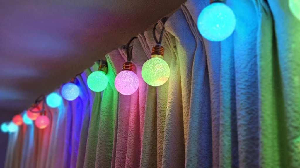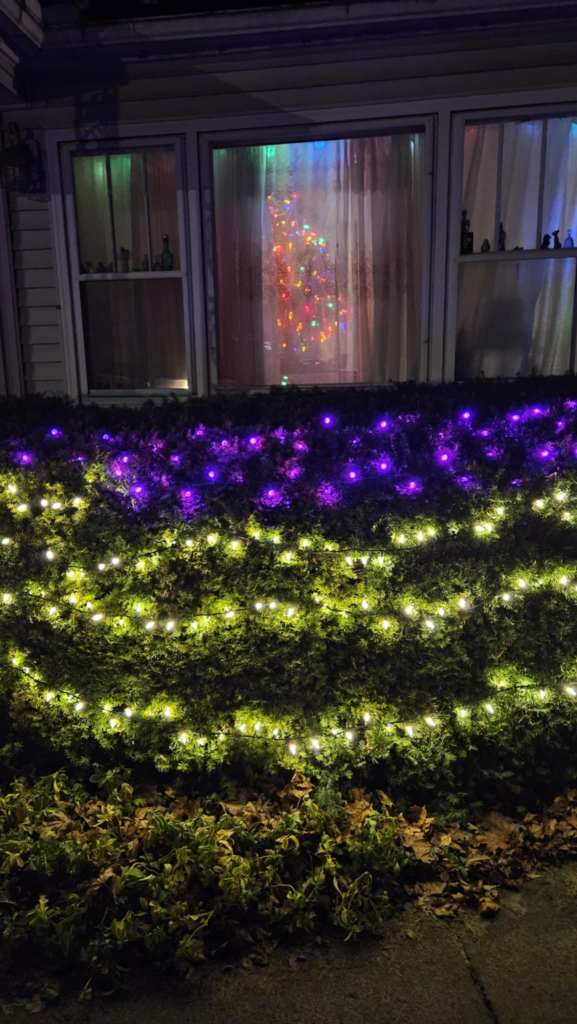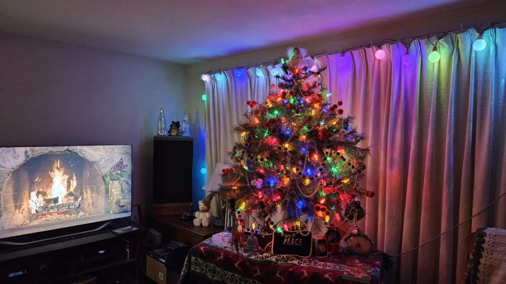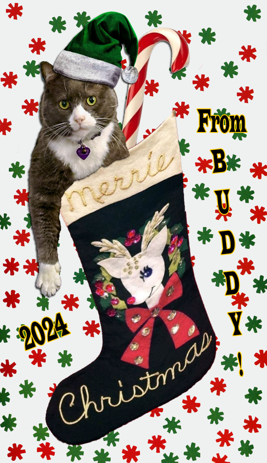 I also found these sweet globe-style Christmas lights to hang on the drapes. I love their retro style and they change colors slowly! I’m also including here my Christmas card to you all, and the greeting I made from our sweet cat Buddy! Enjoy!