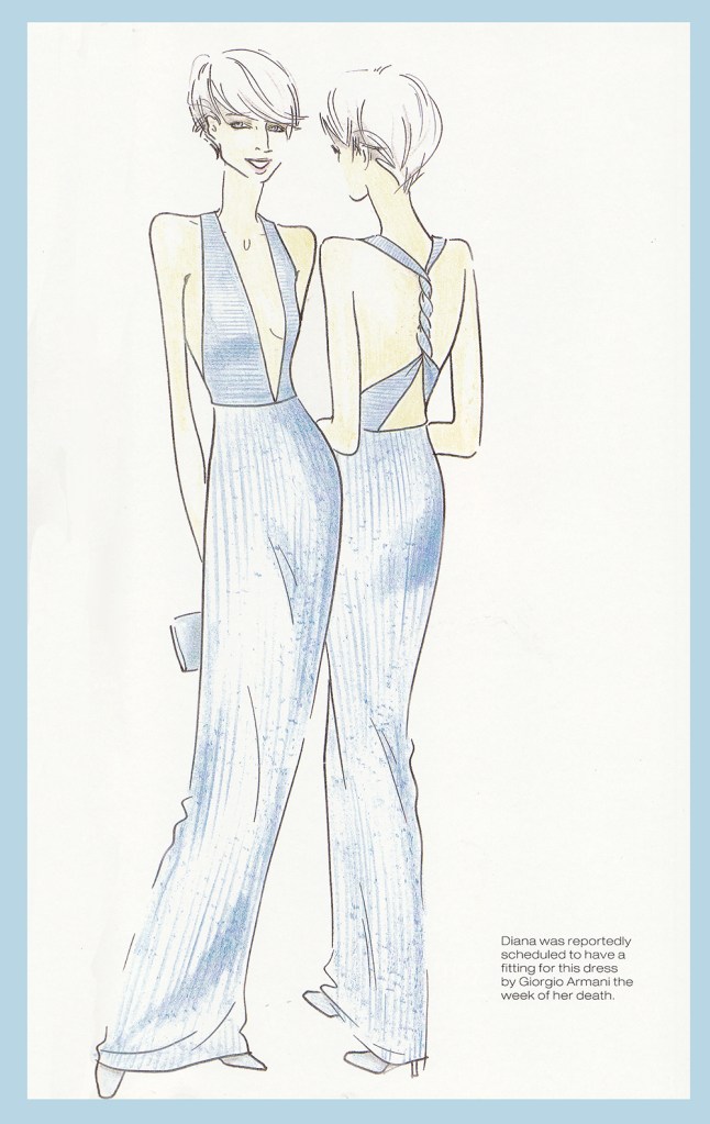 2) A Fashionable Choice: Many Charity related books about Diana’s style came out after her death. One was Diana: The Secrets of her Style by Diane Clehane. It featured a sketch of a very daring gown for her next evening event, an AIDS Benefit, designed by Giorgio Armani. Diana was to have her final fitting for it the week she passed. The gown appears to be an icy blue halter gown with V-neck down to the waist and a twisted back. As you can see, it was very daring, and would have been stunning on her. Was this the coming surprise she hinted at? Since Diana let a lot of her clothes do the talking, this might have been likely, and probably quite startling. This would have been the biggest ‘Get Lost’ dress to the Royal Family she would have worn to date. And she would have been not only breath-taking, but ahead of her time, as usual.