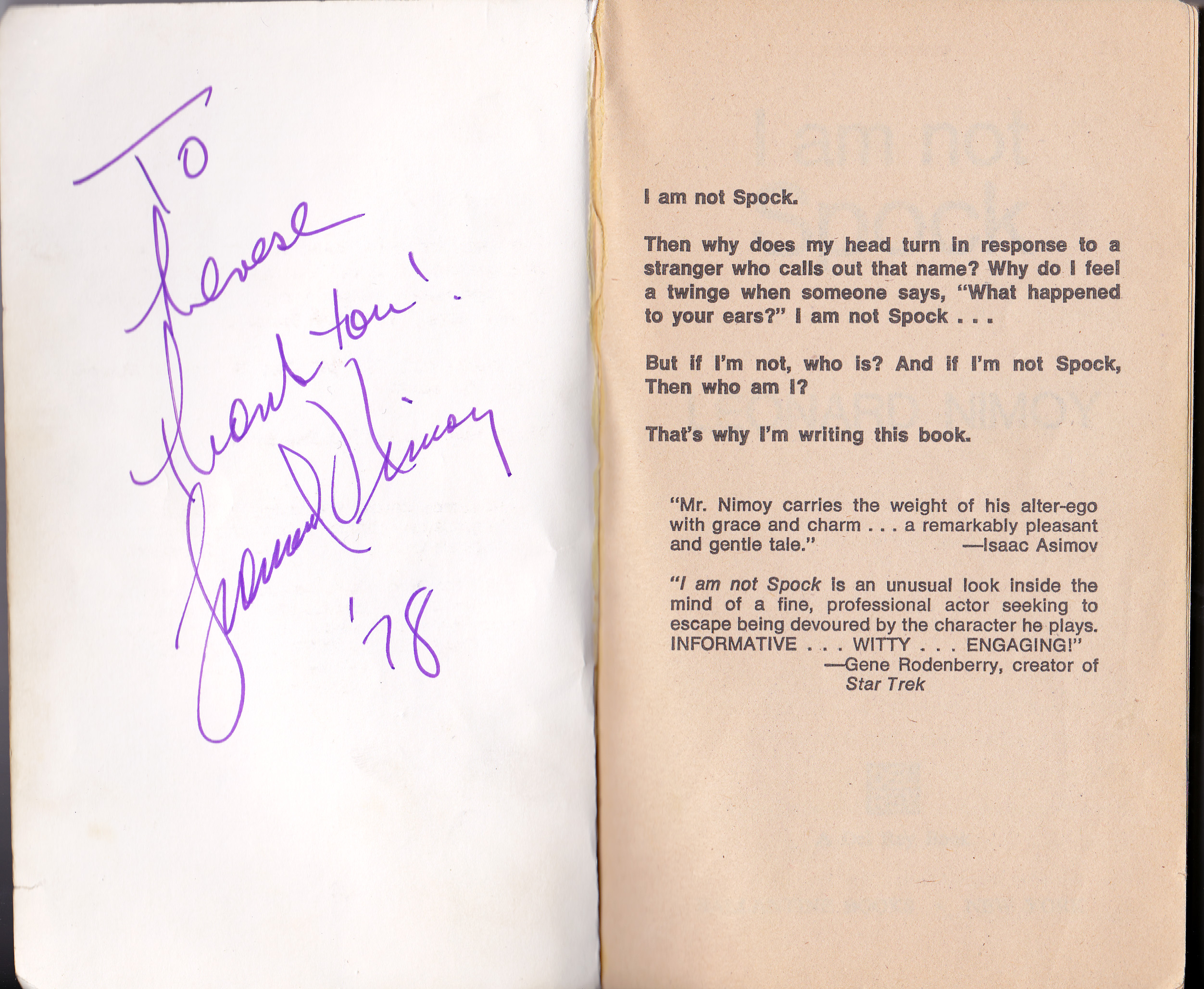 “So, you’re an LNAF’er?”  “Three years!” “Did you get your Yearbook yet?” “Not the ’77. ”  “Oh,” he smiled Well, Louise* was snowed in , you know!”  “Oh.” I replied, and glanced into the mirror, instantly slapping my hands to my face “Oh My God, I’m beet red!” Nimoy just grinned, no doubt used to this teenage hysteria. Flustered but determined, I grabbed my new paperback copy of I Am Not Spock from my purse and handed it to him along with a purple Flair pen.  (Yeah, I still have that pen)