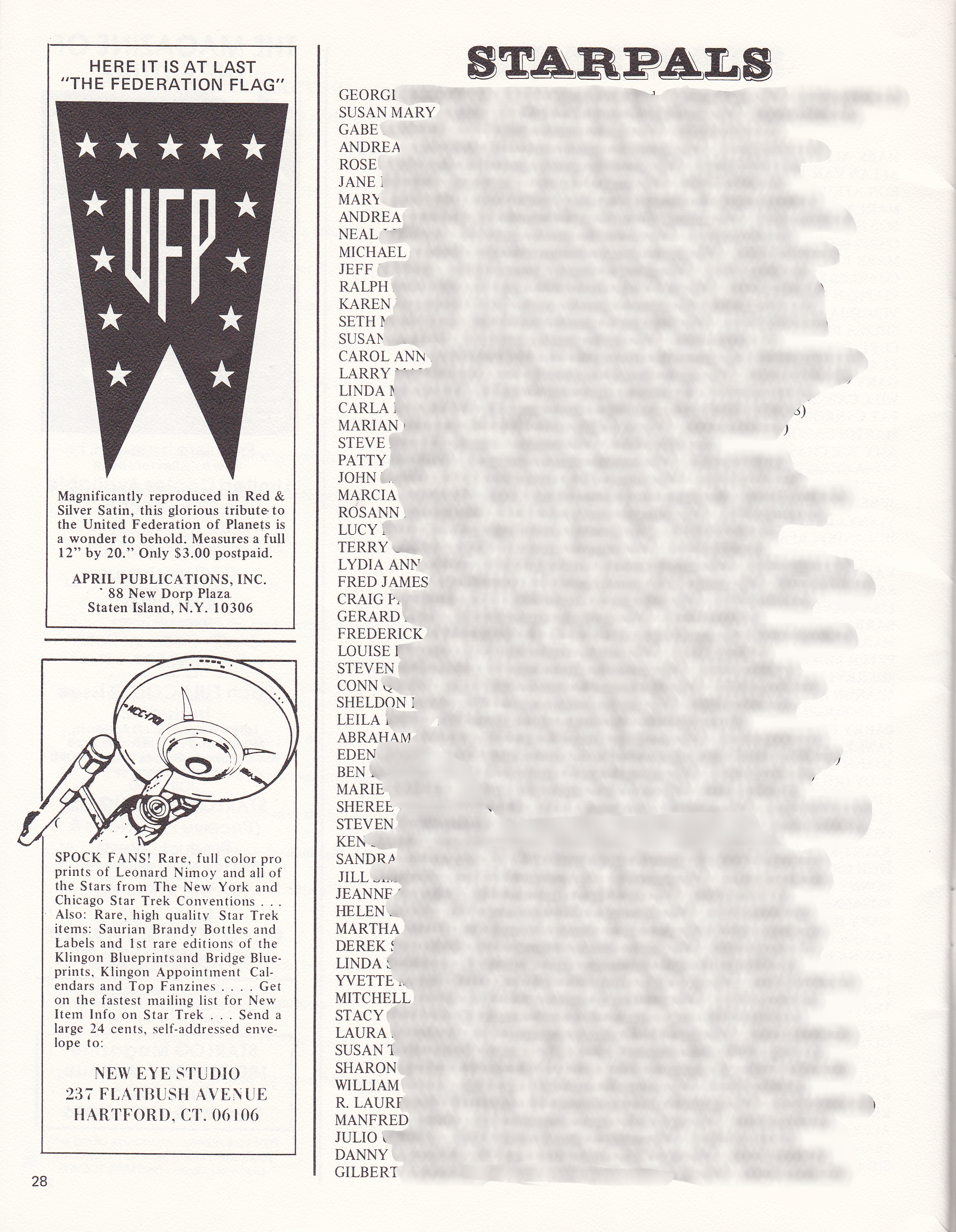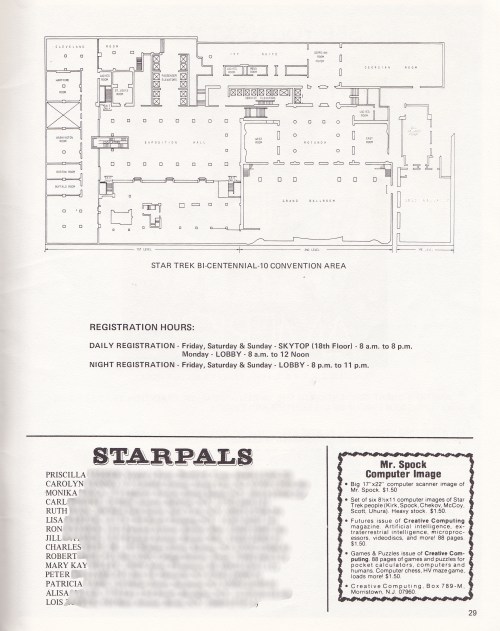 From the back of the program, a couple hundred names and addresses of  “Star Pals”; Trekkies who entered their names, addresses and birth dates –in Stardate code* to be Pen Pals with other Trekkies across the nation!  Are people still Pen Pals anymore, or is it all Twitter and Facebook? The fans range from early teens to the mid twenties, and I’ve blurred out all but their first names for their privacy, but my how times have changed!  Also note the ads for that new publication Starlog Magazine and ads for April Publications and New Eye Studio, jumping on the Trek bandwagon with UFP flags and Saurian Brandy Bottles. Note on the last page, along with the convention  layout of the Statler-Hilton Hotel there’s an ad for  a Mr. Spock Computer Image.  I actually had one of these!  I’ll have to dig it out for a future post.  Of course, we’re talking a computer rendered drawing made by a machine with little markers that draw out an image — pretty impressive for 1976.
