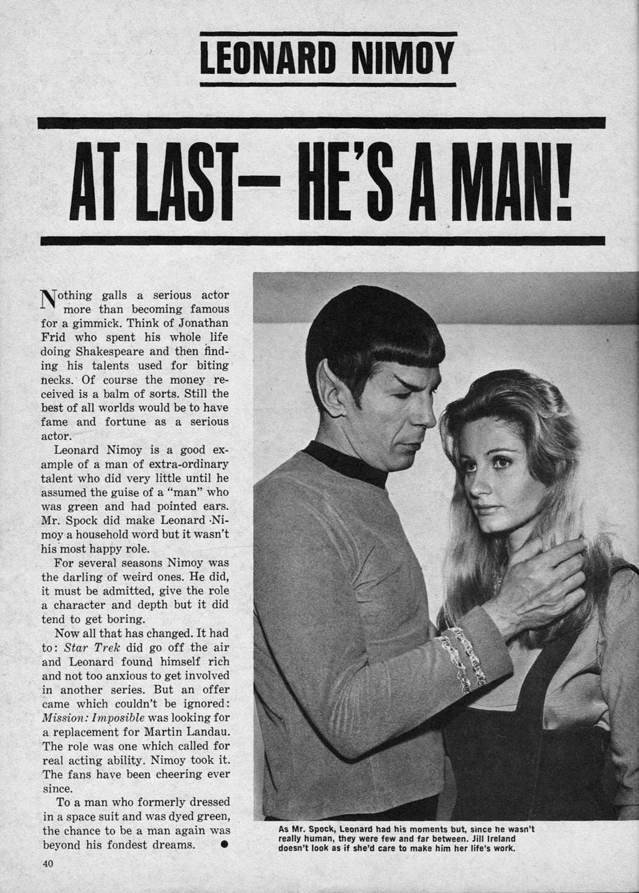 Here’s today’s flashback:  From a movie magazine in the early 70’s, this article declares that Nimoy is at last a man!.  No, it’s not about his Bar Mitzvah some 30 years earlier, but rather how he’s finally playing a human male in Mission Impossible! Yet despite it’s praise for Nimoy’s achievements, the actor was never far from the shadow of Mr. Spock.  I have to admit though, I’ve never thought of Mr. Spock as having ‘green skin’ (it was more just pale with a touch of green cast!)  The snotty caption under the publicity picture doesn’t help!  One has no doubt than Nimoy was all man to begin with!