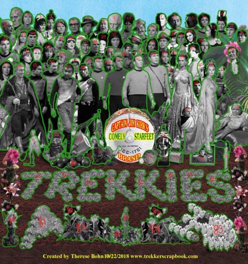 You’ll notice that most of these characters are not crew members, as I did a massive collage of as many Enterprise members as I could in the past. I also intentionally posted some characters in black and white instead of color, like on the original. If you look closely, you’ll see Alexander from Plato’s Stepchildren in Shirley Temple’s place and Balok from The Corbomite Maneuver flopped out like the doll in Rolling Stones sweater too! I even used Star Trek plants to replace the flora of the original. And be sure to look out for 4 hidden Spocks (as well as the main one in the center)!