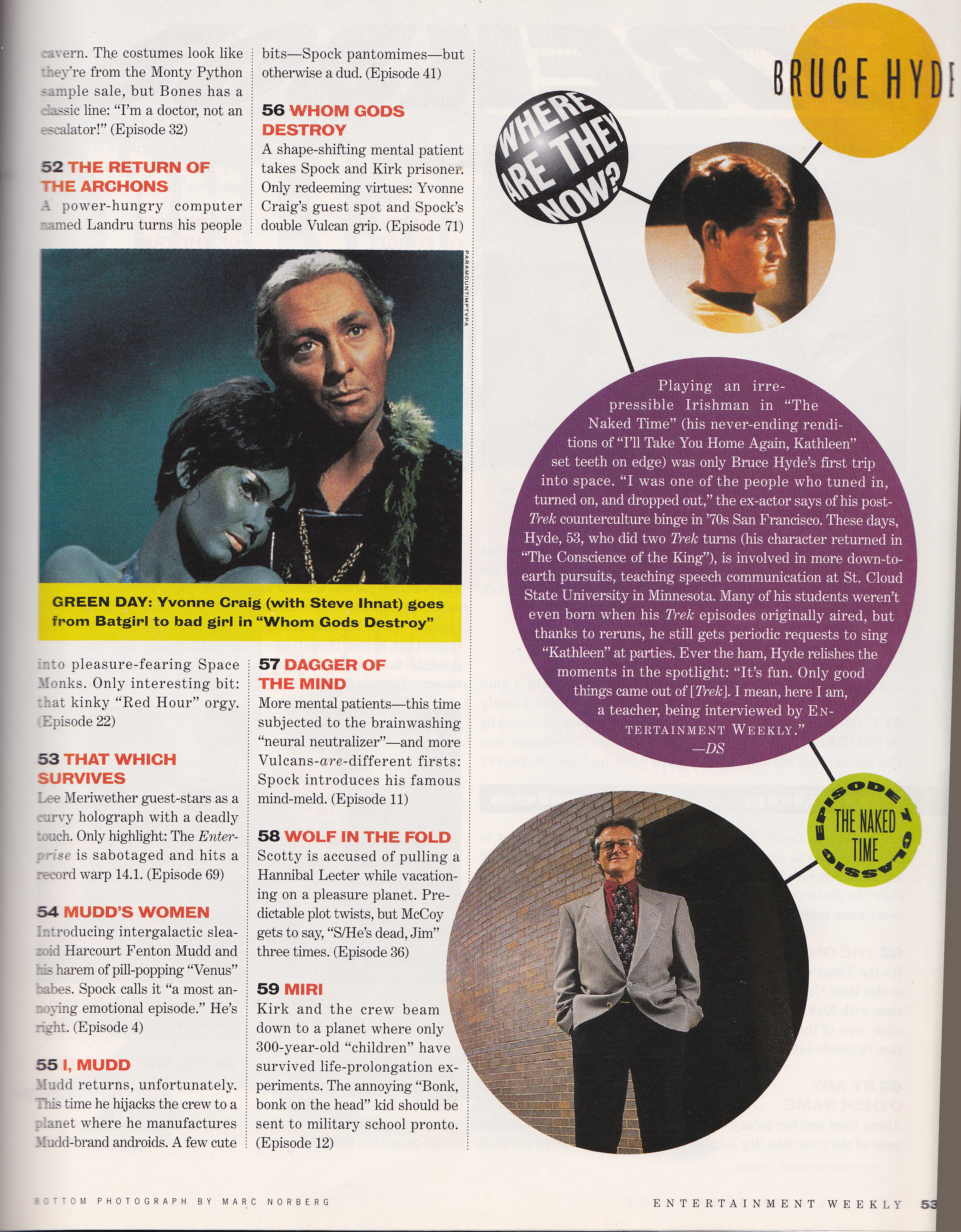 But I hope Trek fans will also recall that Hyde was more than an actor, but also an author and beloved professor emeritus of communication studies at St. Cloud State University in Minnesota, as well as an acting coach. He also appeared on Dr. Kildare and That Girl, as well as in Death of a Salesman on Broadway. You can read more about brilliant Bruce here.