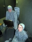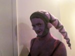 The the hardest part of building my costume was the T’Pau’s complicated hairdo! Seriously, it’s not a hairdo, it’s an Engineering Thesis! The styling took me @ 90 minutes early yesterday morning, as I assembled six different hair pieces into my own for the multi-braid effect. Adding the ears was a little nerve-wracking too, but although it wasn’t too difficult to attach them, I felt sympathy for Mr. Nimoy and anyone who’s had to don those points. Actually, I hardly felt them at all once they were in place,and they worked quite nicely. My favorite part of the costume was the great walking stick, which I made from an $8 wooden chair from the Salvation Army. I reassembled the legs and a spindle from it, and spray painted it black. The filial on top was a door pull from Home Depot, and the big ‘bead’ was a piece of florist foam, carved and painted to look ornamental.