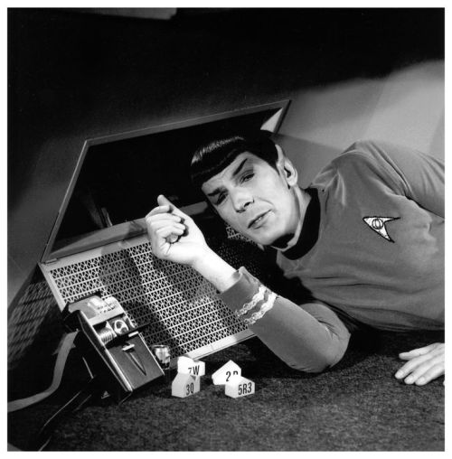 “There’s ya problem right there!” Spock gets horizontal with the Enterprise’s guts. A rare publicity still, although odd that those markers are on the rug in front of him! I think they were markers for where the actors to stand?