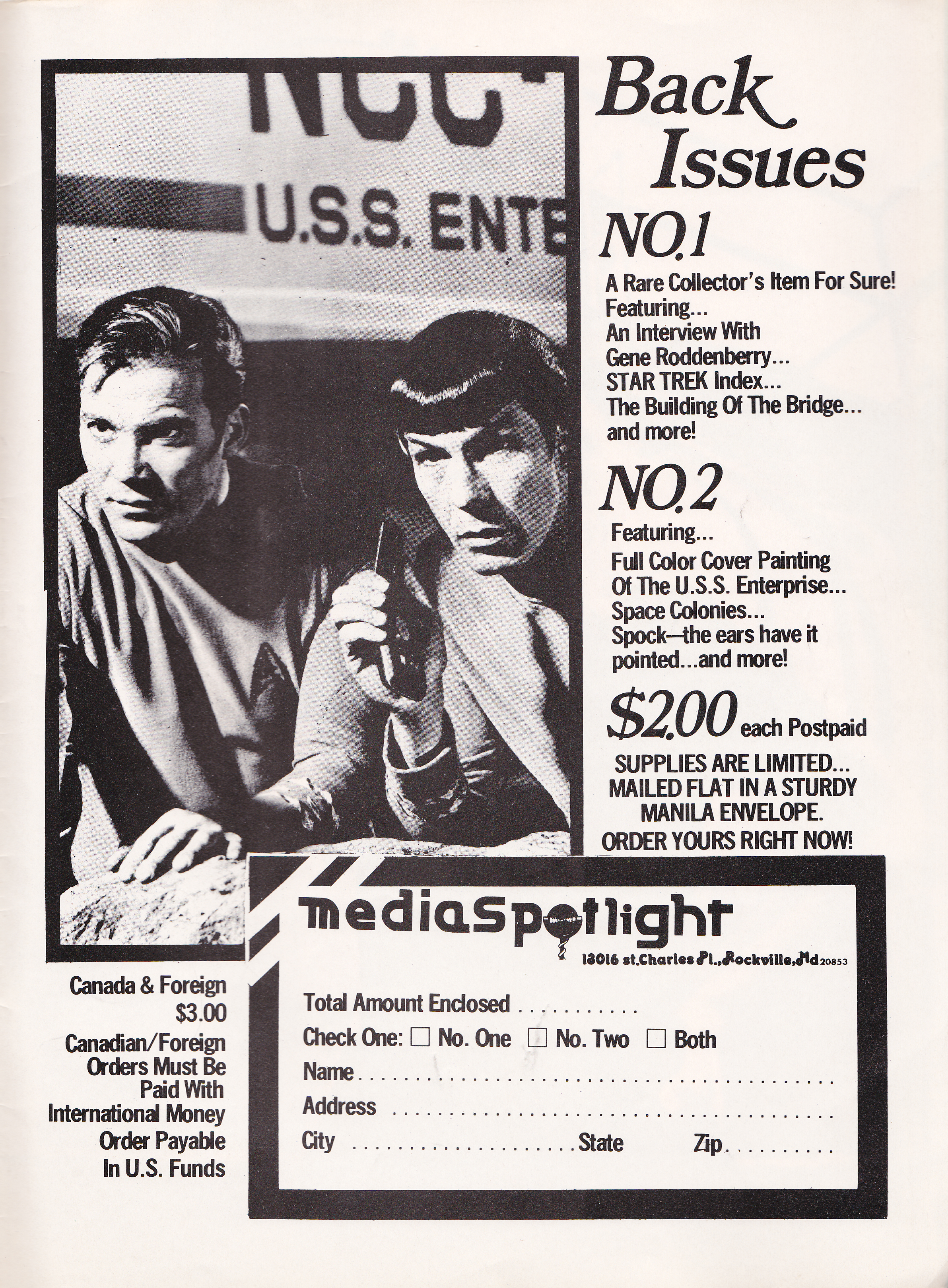 Hey kids, here’s today’s flashback: The last few pages of Media Spotlight and a great photo of swinging George Takei in his best 70’s gear! Good ‘ol George was a regular fixture at the Conventions, always ready with a smile and a pen ready for autographs! George was described in David Gerrold’s World of Star Trek as one of the ‘smilingest’ human beings you were ever likely to meet, and he delivers his million dollar smile here! I love George! Sadly, this is the last of my Media Spotlight Magazine, and I don’t have any more copies, but if I should come across any in my travels, you’ll see the here!