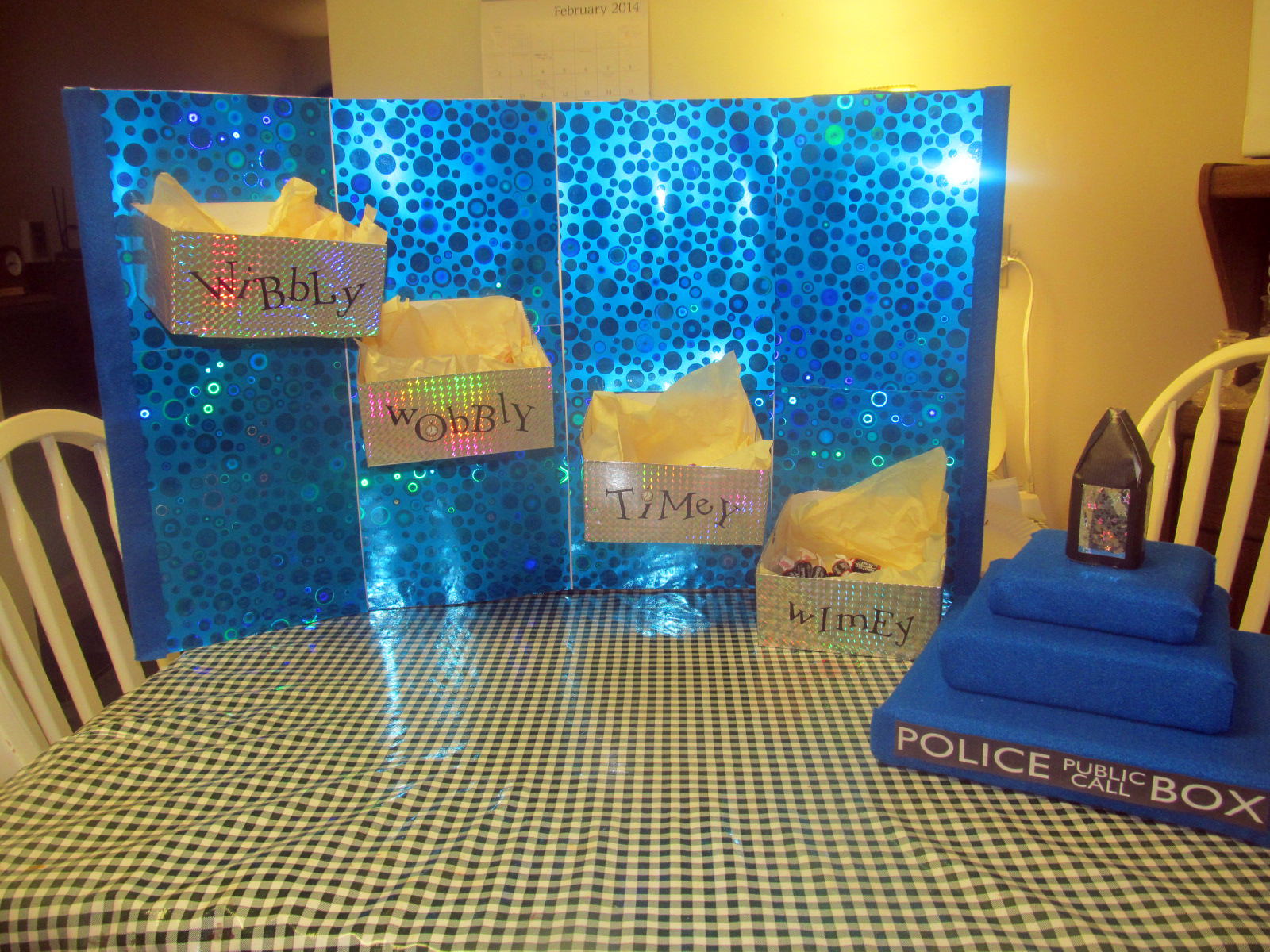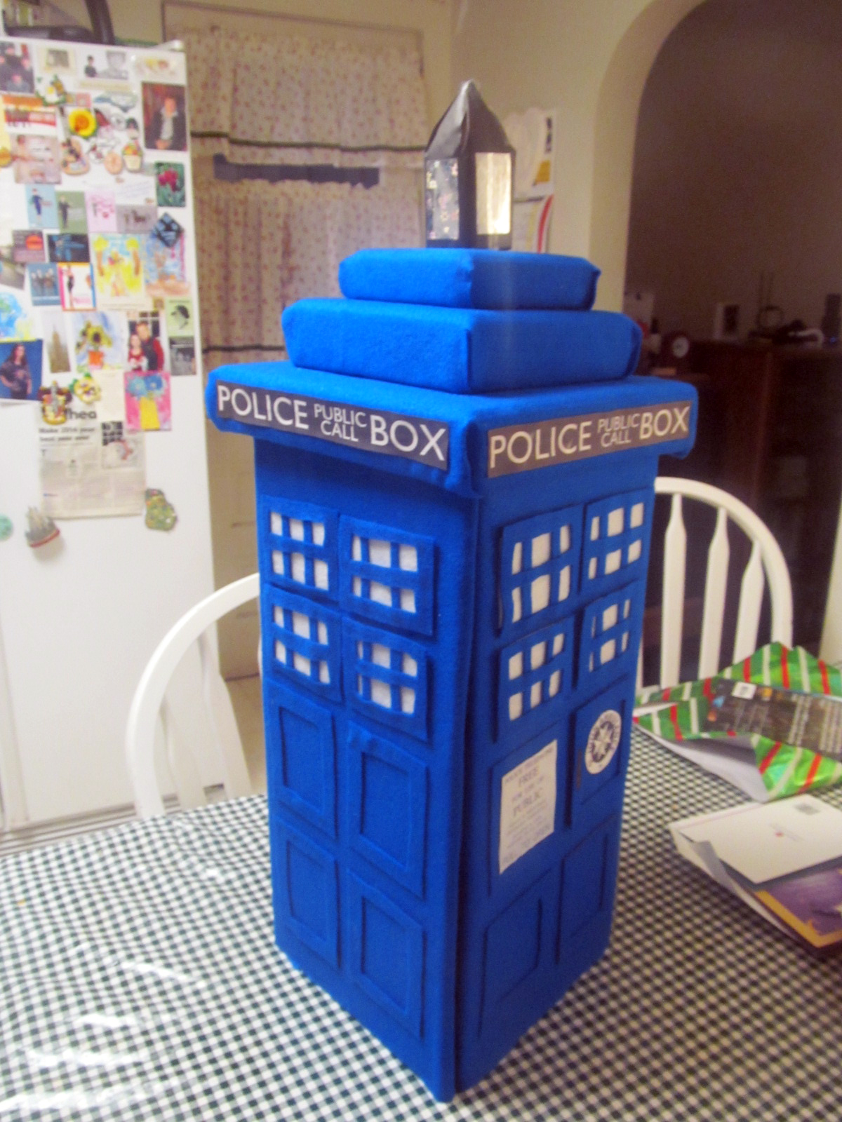 Today was my sweet husband’s birthday, and we love Dr. Who, so I made him his own TARDIS!   And like the real thing, it’s BIGGER on the INSIDE! (And a candy box to boot!)   I got the idea to make this from this picture on the ‘net. although mine’s more crafty, (note the felt exterior, shiny metallic interior and how the candy boxes read “Wibbly Wobbly Timey Wimey”!)  Didn’t know I liked Dr. Who too,eh?  I made it it two days, glad I pulled it off! He got a big kick out of it!   Enjoy!
