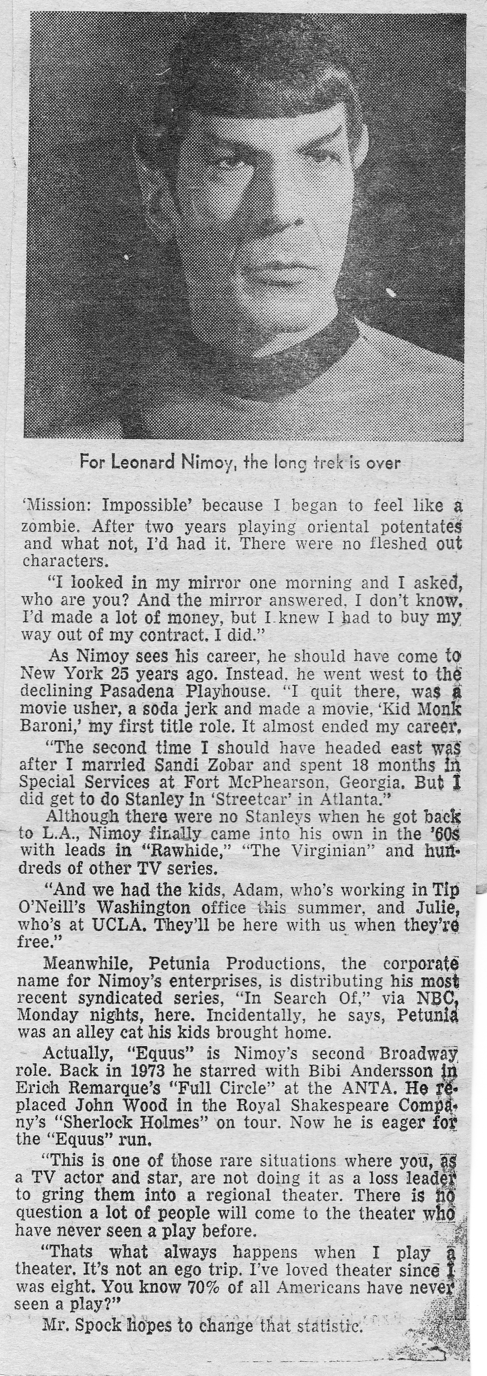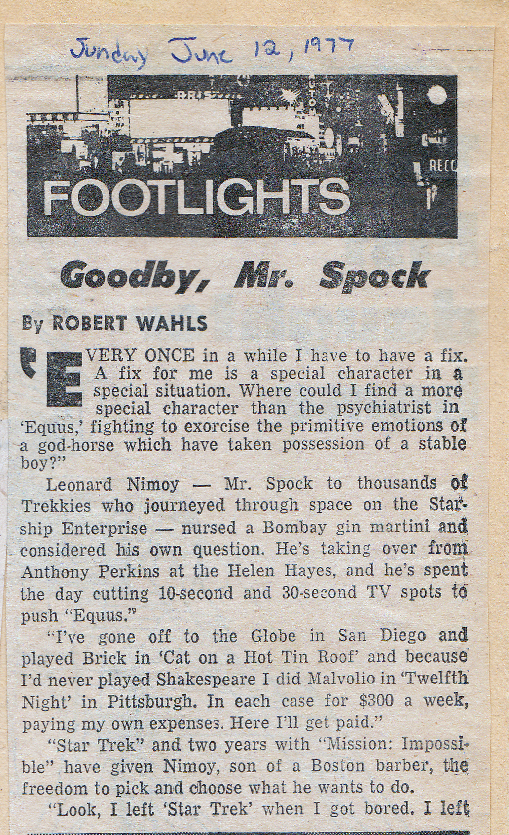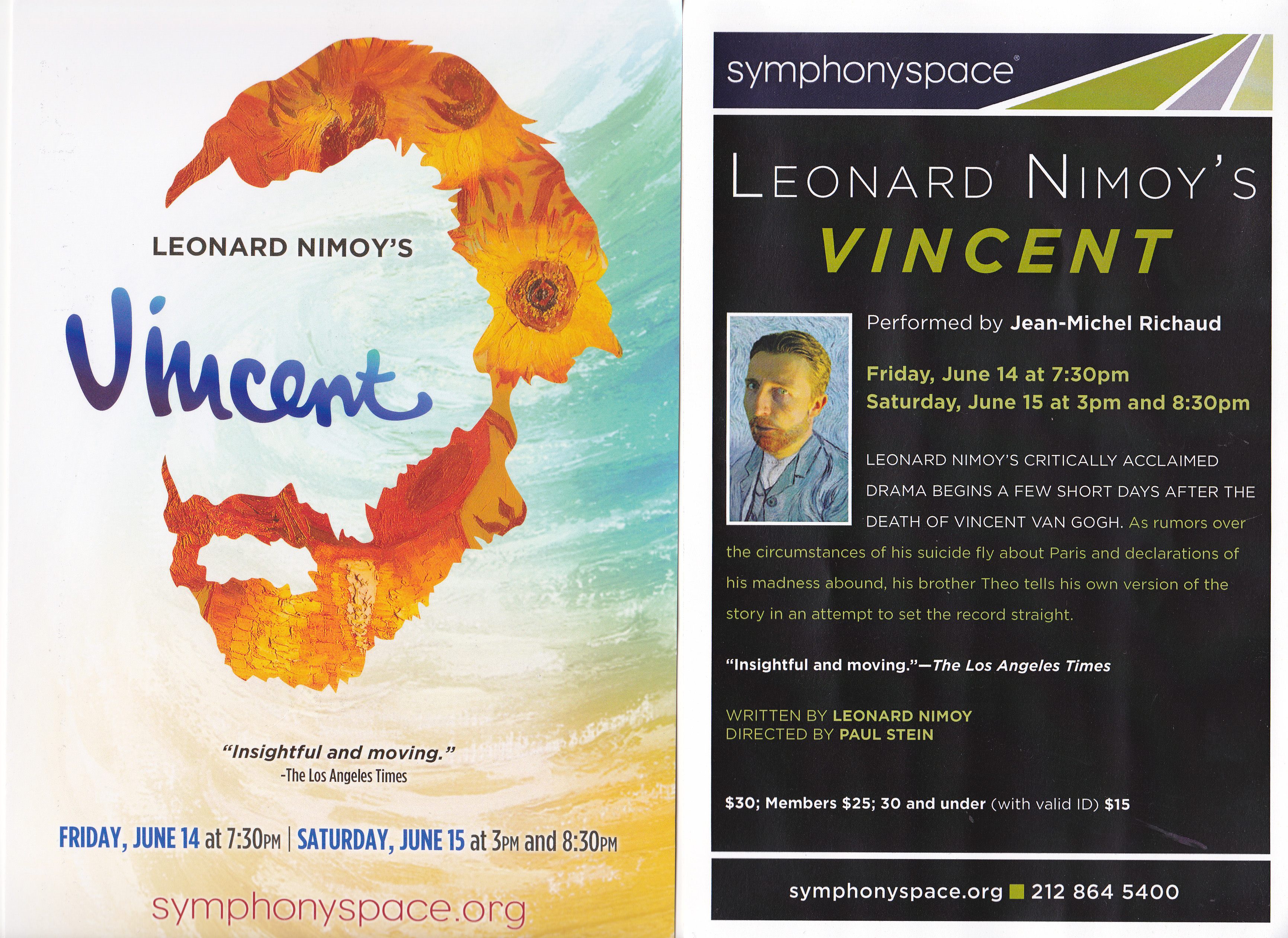I would like to see Vincent make it to Broadway, it certainly deserves that chance. There have been regional productions of it, most recently Mr. Richaud’s in Los Angeles. I think anyone who loves art, passion, and life itself should see it; it is a renewing experience. On a personal note, I found myself keenly identifying with Theo in his grief, as at the time it had only been two weeks since my own mother’s passing, and the play proved to be a bit cathartic to me, and just the tonic I needed to help me through this sad time. (Of course, seeing Nimoy in person afterward was a huge boost to my spirits, but I’ll get to that in a separate post).