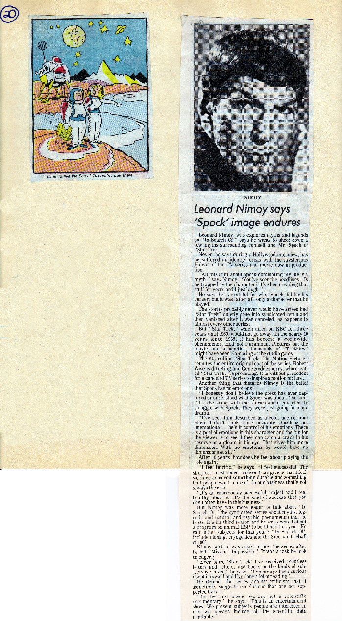 Here’s today’s flashback: From 1978, a reprint of yesterday’s article from our local paper, a quick blurb with a picture of Leonard and Sandy (yeah, I scoured a lot of movies magazines to find any new pictures on Leonard and Trek people, (Man, was I loser or what?) . Is it me or does Sandy always look shocked or worried in pictures? And yet another Grin and Bear It comic, another stereotypical jab at female astronauts (still cute though)