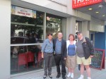 However, as I headed out of the theater, a band of fans were waiting outside the stage door in hopes of seeing Mr. Nimoy. I figured I better hang around too, but after 10 minutes I said “He’s not gonna show up is he?” And another fan said “Yes he will, he’s right there.” And she pointed to the cafe window behind me and I could see him in the cafe with several people… soon they all had their pictures taken with him, the lady in the red jacket too!* As they disembarked I ran out to the front of the theater in hopes of saying ‘Hi’ to him, and by gosh, I got my wish (albeit brief) — Now,